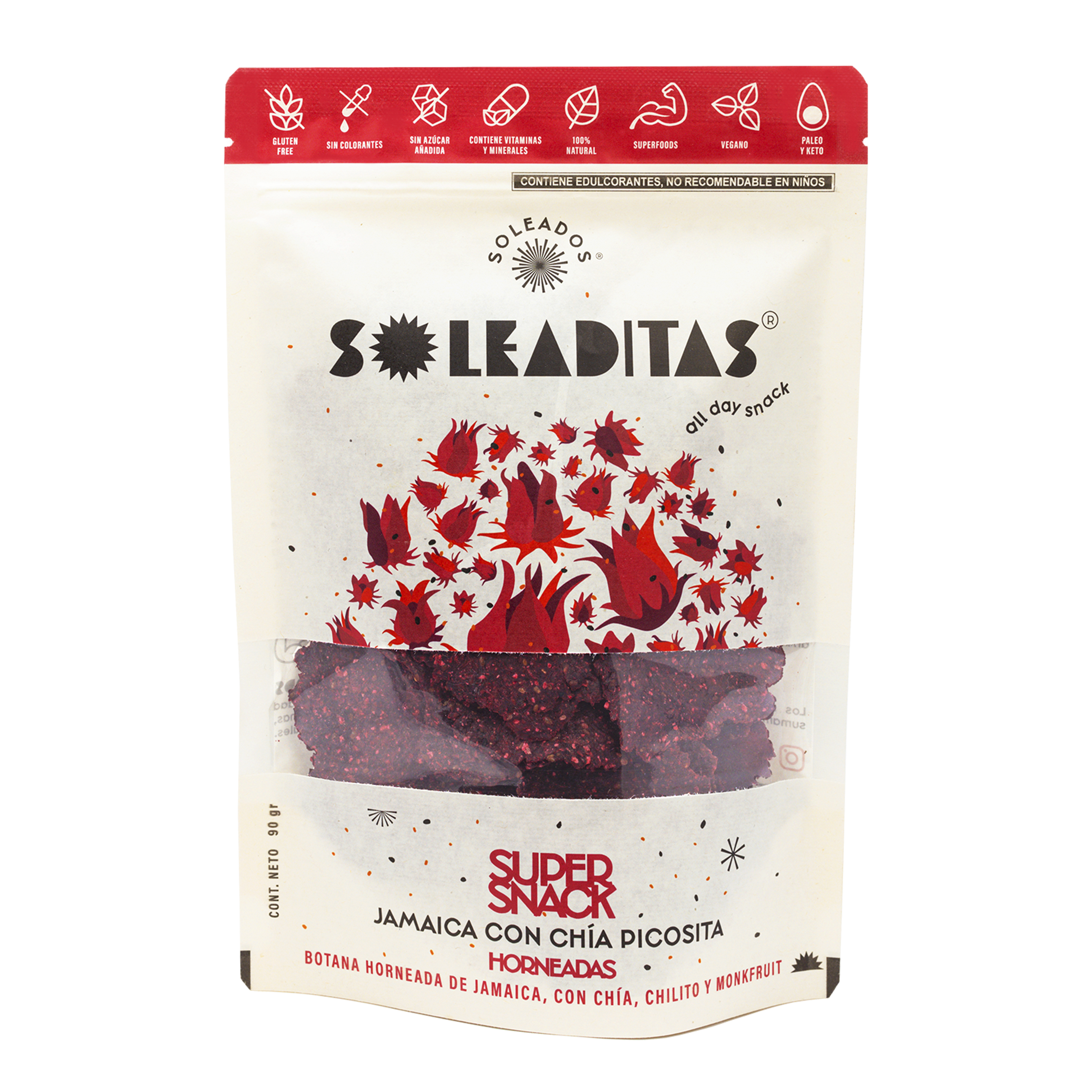 Crujientes, aciditas y enchilositas: Soleaditas de jamaica con chía y chilito, el super snack saludable que te hace sentir bien. 90 gr